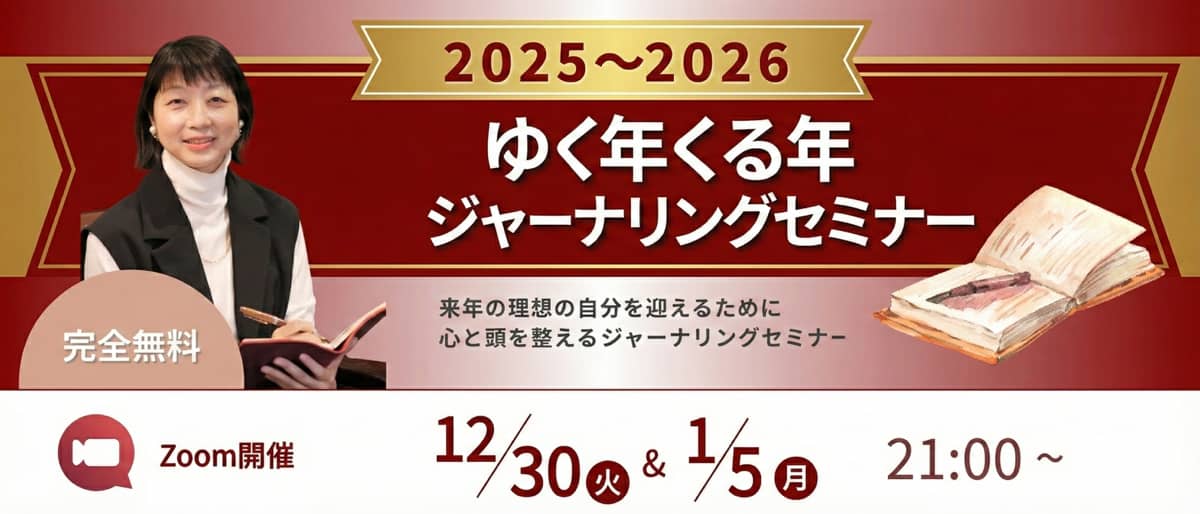 Reader さま こんにちは。 マザーミー事務局の難波です。 気づけば、2025年ももうすぐ終わり。 今年は、どんな一年だったでしょうか? 日々に追われるように 過ぎていく毎日の中で、 ふと立ち止まったとき、 心の奥で感じる 「何か」があるかもしれません。 やり残したようなこと。 まだ言葉にならない気持ち。 これからどう進んでいこうかという、 ぼんやりとした不安や期待――。 そんな年末特有のモヤモヤを、 ひとりで抱え込まずに、 静かに書いて、 整える時間を持ってみませんか^^? 今年も開催します ✍️ ゆく年くる年ジャーナリングセミナー 「ジャーナリングって?」 ジャーナリングは、 感じていることや思っていることを、 ただ紙に書き出すシンプルな方法です。 心がほどけていく感覚を 味わうことができます。 書いてみると、 自分でも気づかなかった思いに出会えたり、 ずっと引っかかっていた感情が スッと流れていったり。 大切なのは、 上手に書くことではなくて、 「本音」を、 そのままそっと紙の上に置いていくこと。 【こんな内容でお届けします】 * ジャーナリングって、どうやるの? * 書くことで、心の中に起きる変化 * 2025年の自分を、やさしく振り返る時間 * もう持たなくていい思考や感情の手放し * 2026年を、自分らしく迎えるための未来ビジョン ※ はじめての方でも大丈夫。 【開催日・場所・お申し込み】 第1回:2025年12月30日(火)21:00〜22:00 第2回:2026年1月5日(月)21:00〜22:00 場所:Zoom 料金:無料
